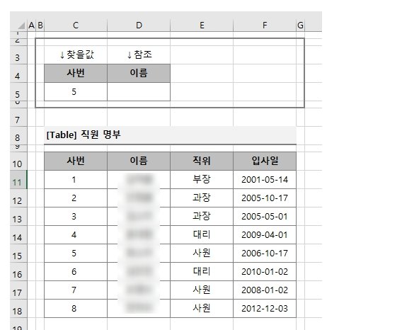 예제2. 사번이 5번인 사원의 이름과 직위, 입사일을 vlookup 함수로 찾아서 표로 만들어 보겠습니다.