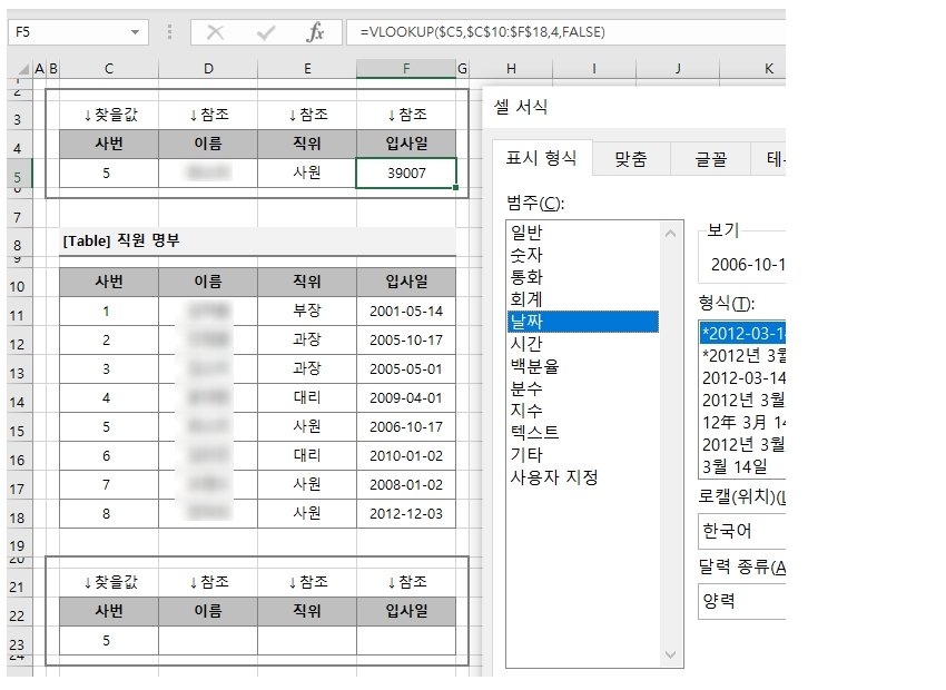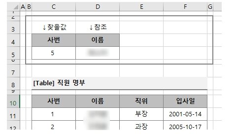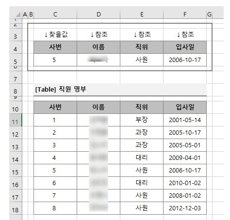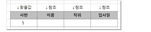 예제2. 사번이 5번인 사원의 이름과 직위, 입사일을 vlookup 함수로 찾아서 표로 만들어 보겠습니다.