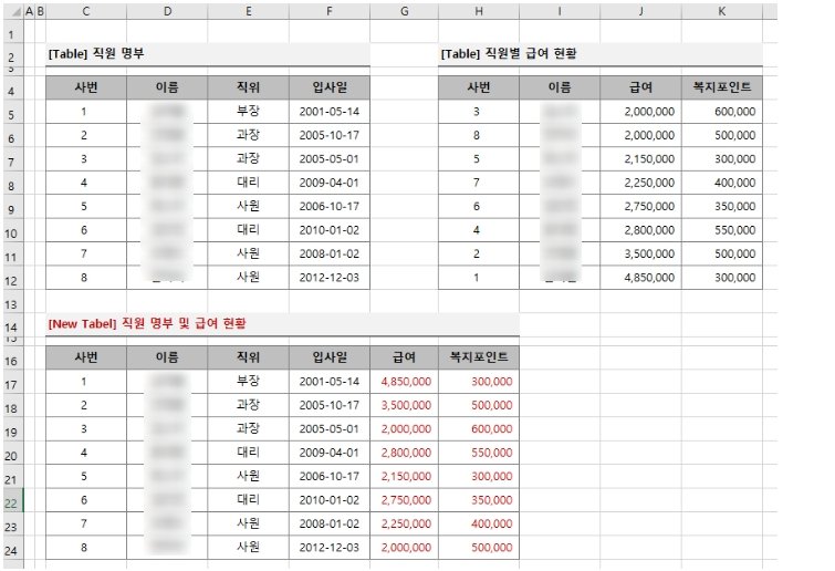 예제3. 이번엔 vlookup 함수로 다른 표의 값을 불러와서 2개의 표를 합쳐보겠습니다.