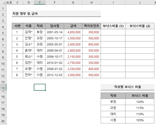 예제[표. 직원명부 및 급여]에 [표. 직위별 보너스 비율]을 참조하여 직원별 보너스비율을 산출하겠습니다.