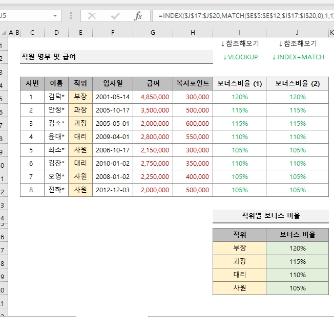 예제[표. 직원명부 및 급여]에 [표. 직위별 보너스 비율]을 참조하여 직원별 보너스비율을 산출하겠습니다.