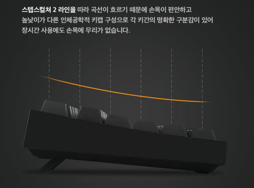 키캡은 스탭스컬쳐 2 방식의 키캡 방식입니다. 스탭스컬쳐1은 자판을 오목하게 만들어 곡률을 높인 형태이고, 2는 키캡의 윗부분을 빗면으로 각도를 만든 인체공학적 디자인입니다.