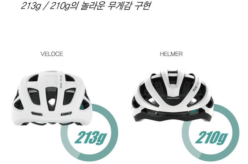 벨로체 213g, 헬머 210g입니다. 무게에 큰 차이는 없습니다.