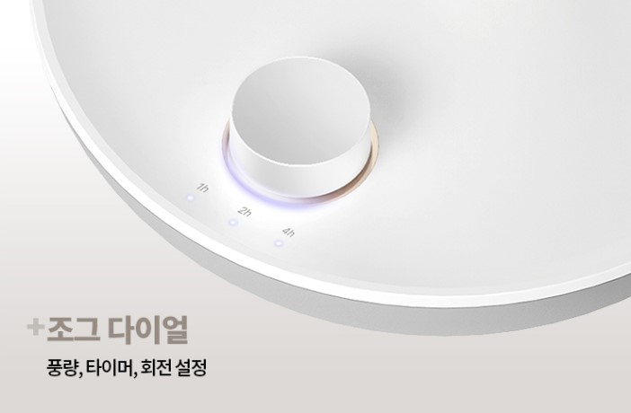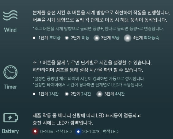 이 조그 다이얼은 다양한 기능을 지원하는데요 바람은 최대 4단계, 타이머는 1~4시간 까지, 배터리 경고등의 기능을 수행합니다.
