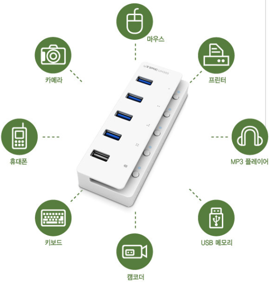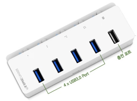 UH305는 4개의 3.0 포트와 1개의 충전 전용 포트가 지원됩니다. 총 5개 이죠 앞서 말씀드린 대로 USB 메모리, 외장하드, 카드리더기, 디지털카메라, 키보드, 마우스, 프린터, 스캐너 등 USB를 사용하는 전자기기라면 대부분의 것들이 연결됩니다. 한 개의 포트를 PC와 연결시키면 5개의 포트로 확장시킬 수 있으니 1석 5조라고 보면 되겠습니다.