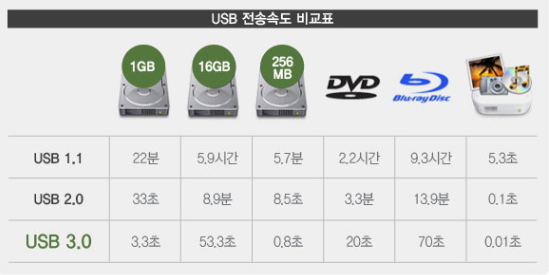 USB2.0의 경우 전송속도는 480 Mbps이며 USB3.0의 경우는 Super Speed를 지원하기에 5 Gbps의 속도로 대용량 데이터를 전송할 수 있습니다. 물론 PC나 장치도 USB3.0을 지원하는 경우의 최대속도입니다.