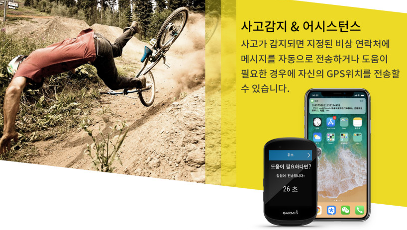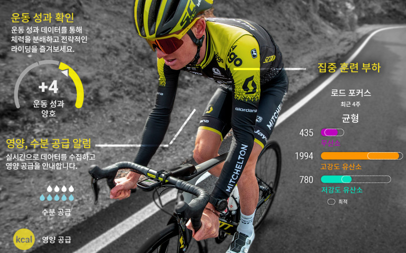 다양한 모니터링 기능이 있습니다. VO2 MAX, 회복, 훈련 부하 포커스, 열, 고도 적응, 영양, 수분 공급에 대한 정보 제공과 더불어 안전기능으로 바이크 알람, 그룹 메시지 전송 및 추적, 사고 감지 기능으로 후미등인 Varia 리어뷰 레이더 및 전조등이 연동됩니다. 물론 가민에서 판매하는 Varia RTL515 후방 라이트(258,000원), Varia UT800 전조등(140,000)이 대상입니다.
