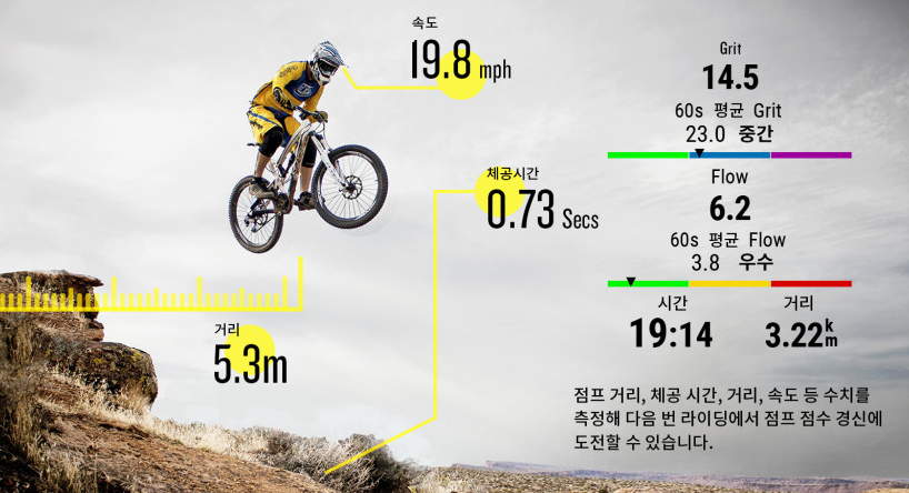 MTB 다이내믹스의 경우 점프 횟수, 점프 거리, 체공시간, 라이딩 난이도 측정 (Grit) 및 내리막 주행의 매끄러움을 측정하는 Flow 수치를 측정하고 다음 라이딩 시에도 참고할 수 있습니다.