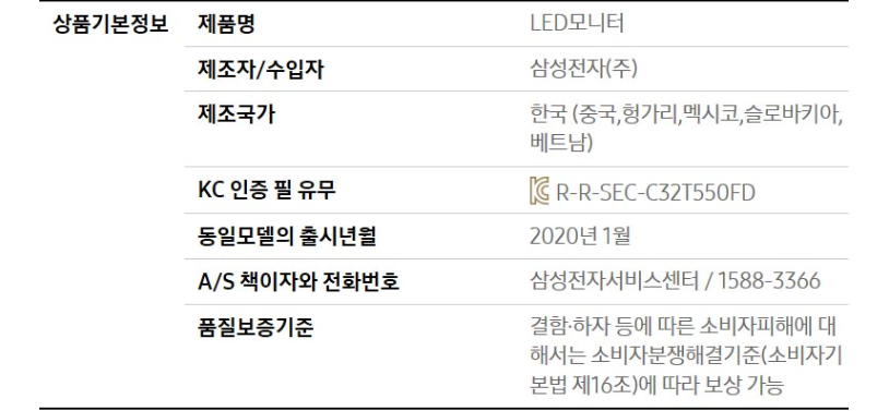 정식 명칭은 LC32T550FDKXKR 이며 디스플레이 80.1cm, 화면비율 16:9, 해상도 1920x1080입니다.
