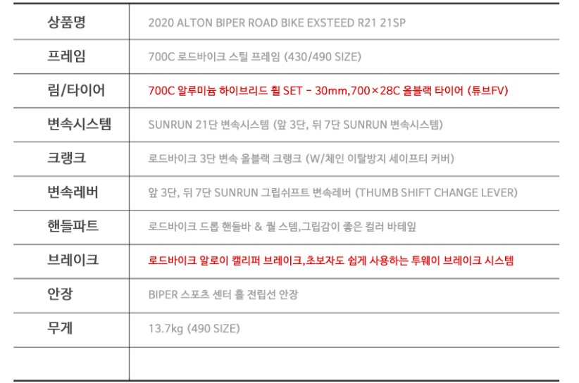 변속은 앞서 말씀드린대로 21단의 변속 시스템, 430/490 사이즈, 투웨이 브레이크 시스템이 특징으로 초보 로드바이크 입문자들이 가격에 대한 부담이나 제동부의 미숙함에 대해 큰 부담 없이 접근하기 좋겠습니다.