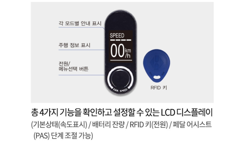 디스플레이는 LCD이며 기본 상태, 배터리 잔량, RFID키, PAS 단계의 조절이 가능합니다.