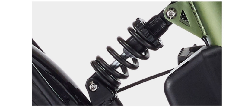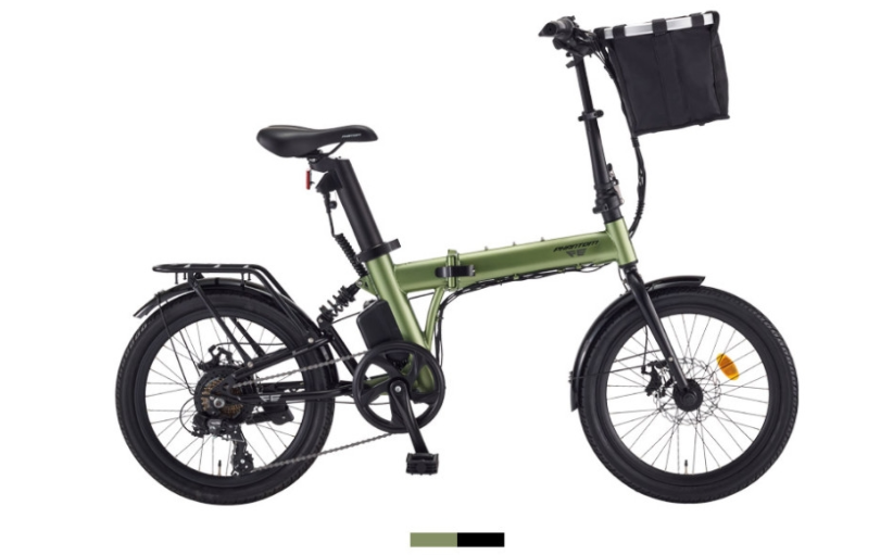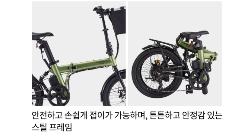 20인치 휠셋, 스틸 접이식 프레임, 기계식 디스크 브레이크, PAS/스로틀 겸용입니다. 색상은 카키/블랙 (무광), 다크 실버/블랙의 두 가지 구성으로 판매되고 있습니다.