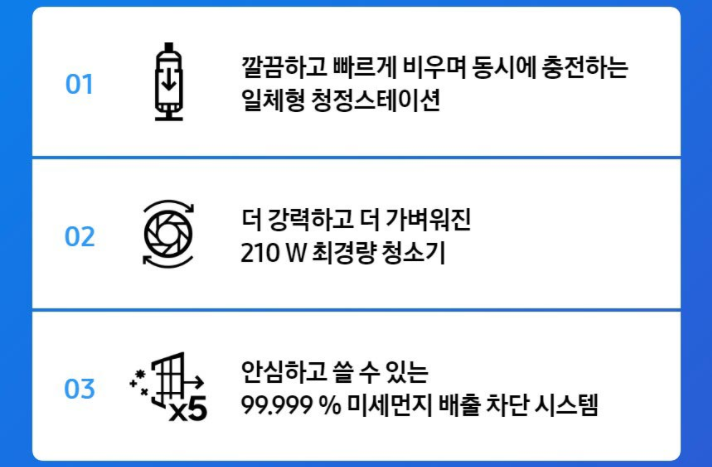 이 청정 스테이션이 비스포크 제트의 가장 큰 특징으로 일체형입니다. 충전과 먼지통을 비워주는 역할을 하는데 에어 펄스 기술로 먼지 날림의 거의 없고 세어 나올 수 있는 미세먼지를 차단시킵니다. 청정 스테이션의 먼지봉투를 통째로 빼내어 버릴 수 있도록 편의성이 제공되고 있어 청소후 먼저처리에 대한 고민이 없습니다. 비싼 출고가에 대한 납득할만한 이유로도 보여집니다. 청정스테이션도 마찬가지로 제10-2208334호에 특허등록이 되어 있습니다. 청정스테이션의 먼지 흡입 모터 또한 평생 보증을 내걸었습니다.
