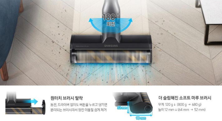 슬림 소프트 마루 브러시를 지원해 바닥면의 미세먼지를 손쉽게 제거할 수 있고 브러시는 180도 회전이 가능한 헤드이기 때문에 모서린, 접은 틈새  등의 청소가 수월합니다.