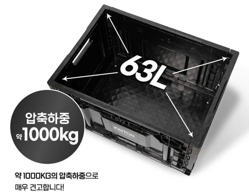 양쪽의 측면방향이 모두 열리기 때문에 수납 시는 물론, 다단으로 적재한 경우에 캠핑용품을 꺼낼 때도 매우 편하게 보입니다. 내부 용량은 63L로 캠핑은 물론, 사무실, 창고, 리빙박스로의 쓸모도 보이고 있습니다. 압축하중은 약 1000KG으로 성인 두 명이 올라가도 괜찮다고 하니 튼튼하게 사용하기 좋습니다.