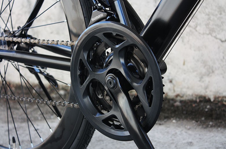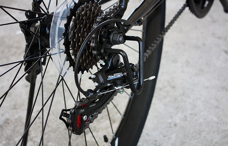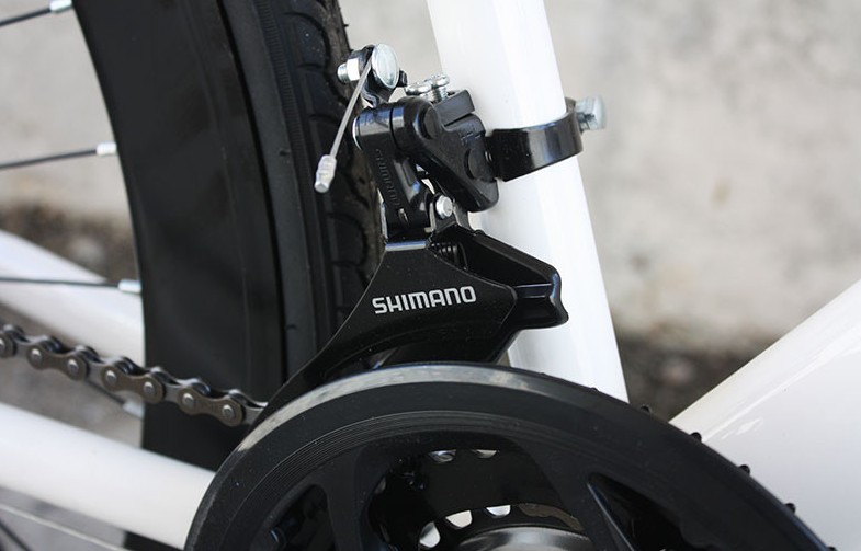 크랭크는 28-38-48T 3단으로 체인 이탈 방지 크랭크 커버이며 시마노 21단 프런트 드레일러가 사용되어 있습니다. 뒷 드레일러는 시마노 투어니입니다.