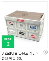 이 때문에 필요한 게 바로 다용도 캠핑 박스입니다. 캠핑 박스는 넓은 용량과 다양한 쓰임 성(테이블, 조리도구, 의자, 침대 등)을 가지고 있고 넓은 용량에는 자잘한 캠핑장비를 깔끔하게 수납하여 물건의 정리를 도와주기 때문입니다. 이츠 라이프의 다용도 접이식 폴딩 박스는 비교적 넓은 용량에, 폴딩이 가능하고 상판은 다양하게 사용될 수 있습니다. 폴리프로필렌 재질로, 상판 소재는 원목(별매)과 폴리프로필렌이 사용되었고 무게는 비교적 1.5kg으로 가볍습니다. 편의사항으로 손잡이가 있어 편하게 들어 옮기기 좋겠습니다. 가격 또한 9,900원(최저가 기준)으로 매우 저렴합니다. 쇼핑 판매 순위는 캠핑 박스 2위로 많은 상품평이 등록되어 있습니다.