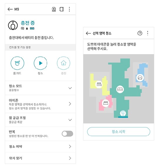 그 외 홈가드 기능이 있습니다. 지정된 위치에서 사물의 움직임을 감지할 경우 5장의 사진을 촬영하여 스마트폰으로 알려주는 기능으로, 충전대에 있을 경우에만 사용가능하고 제품에 마른 걸레가 부착된 상태로 사용해야 합니다.