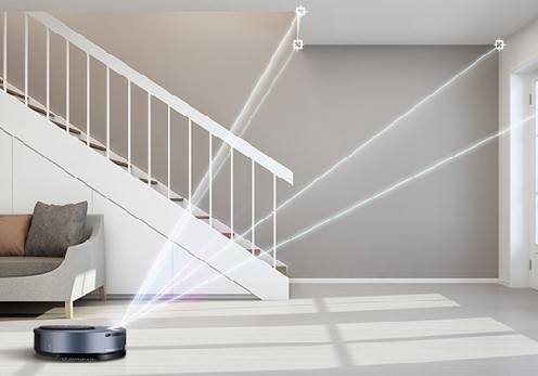쿼드코어 CPU가 적용 인공지능 딥러닝 기술로 70만 장의 사물 이미지로 학습하였다고 합니다. 상단 하단의 듀얼아이 시스템으로 이동 거리 계산 및 최적의 경로를 찾습니다. 상단 센서는 공간과 사물의 특징점을 파악하여 집안의 지도 작성을 수행합니다. 하단 센서는 바닥 이미지 촬영으로 이동 거리와 위치 경로를 확인합니다.