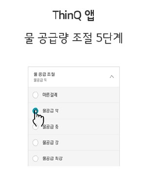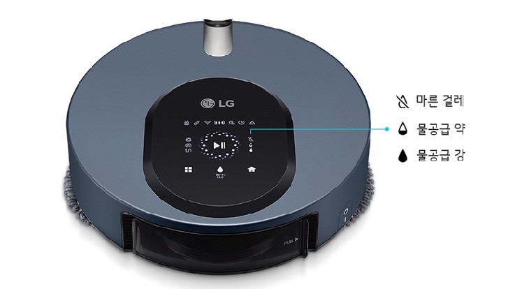 물공급은 5단계로 조절할 수 있습니다. 선택은 마른걸레, 물공급 약, 물공급 중, 물공금 강, 물공급 최강 의 선택이 가능 하며 LG ThinQ App을 통해 5단계 설정을 할수 있습니다. 청소기 본체에서는 3단계만 설정할 수 있습니다.