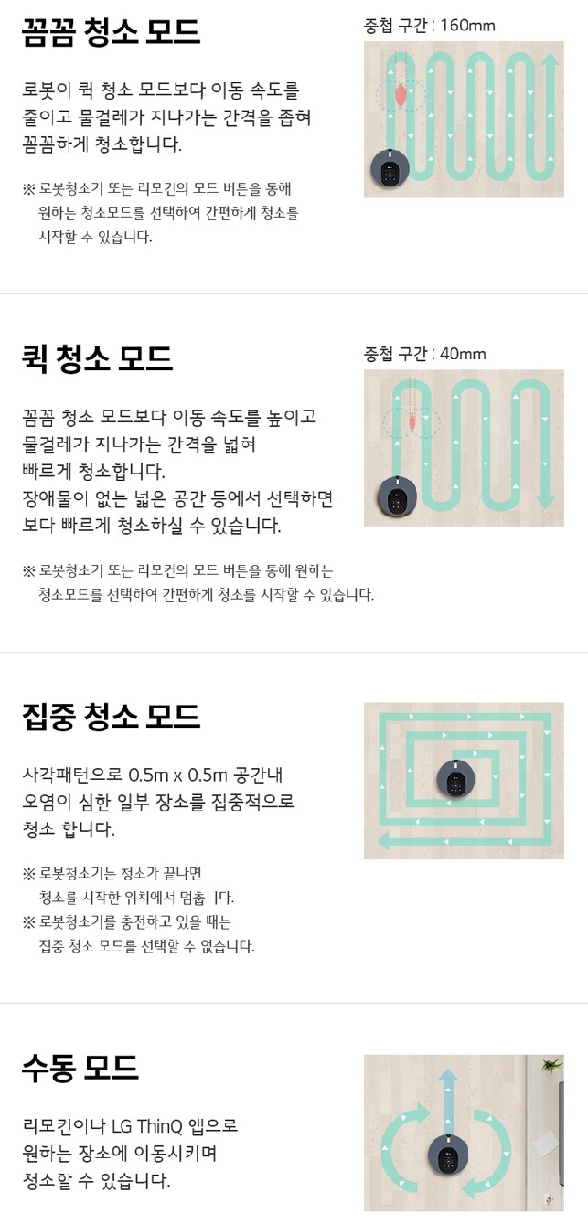 꼼꼼 청소, 퀵 청소 모드, 집중 청소 모드, 수동모드를 지원합니다. 소음은 44dB의 저소음으로 매우 조용합니다.