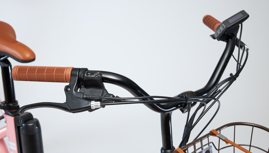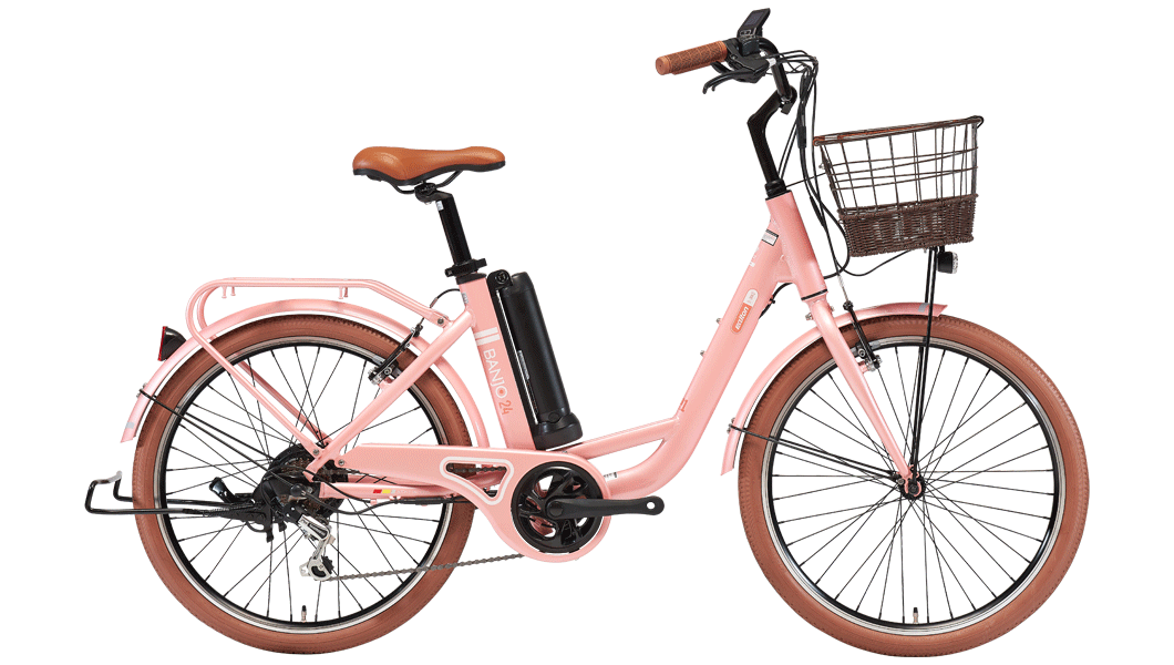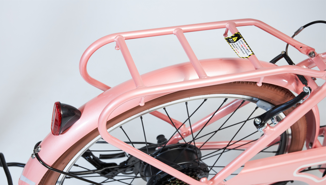 차체는 24*495 배터리 외장형 알루미늄 부인용 프레임, 스틸 리지드 포크 등입니다. 색상은 살몽 핑크, 다크 그린, 베이지, 블랙 4가지를 지원합니다.