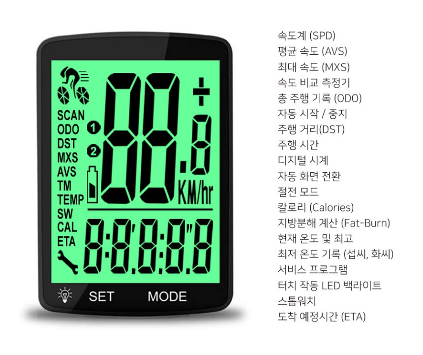 속도계, 평균속도, 최대속도, 속도비교측정기, 총 주행기록, 자동시작/중지, 주행거리, 주행시간, 시계, 자동 화면 전환, 절전모드, 칼로리, 지방분해 계산, 현재 온도, 서비스 프로그램, LED 백라이트, 스톱워치, 도착 예정시간의 기능을 지원합니다.