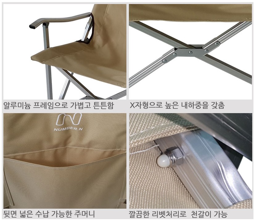 알루미늄 프레임, x자형 구조로 내하중 증가, 넓은 수납주머니, 천갈이 가능 한 특징을 가지고 있습니다.