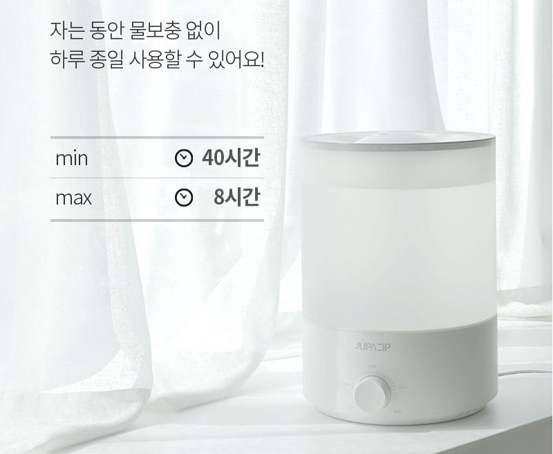 이 제품은 주파집에서 만들었으며 19년 11월에 등록되었습니다. 초음파가습기로 물통용량은 4L의 대용량이며 상부에 급수하는 형태로 세척도 간편하게 할 수 있습니다. 가습량은 500cc로 연속 40시간 사용할 수 있으며 부가기능으로 무드 램프, 물 없음 알림, 타이머 등입니다. 가격은 40,900원(최저가 기준)