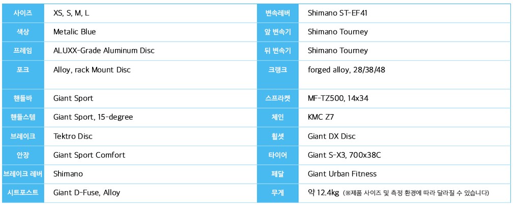 사이즈는 S, M, LM XL로 대부분의 신장에 적용되며 (160cm~190cm), ALUXX 등급의 알루미늄 프리엠, TEKTRO 디스크 브레이크, 자이언트 S-X3 700x38 C 사이즈 타이어를 사용하여 주행 안정성이 좋습니다.
