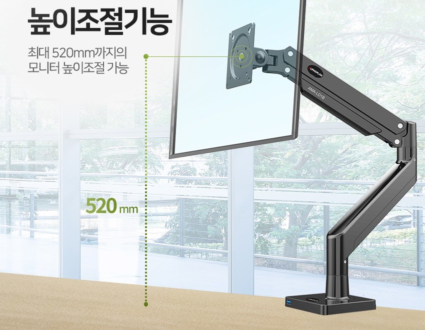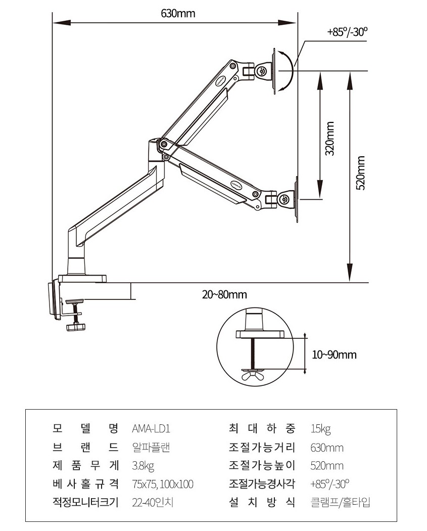 모니터 암 사용으로 좁은 공간을 더 넓게 활용이 가능합니다. 가스 실린더 방식으로 고중량 하중에도 자유자재로 조절이 가능하며 최대 630mm까지 모니터 거리 조절을 할 수 있으며, 높이는 520mm까지 조절하며, 상하 각도 조절 또한 -30도부터 +85도까지, 3축 회전 시스템, 360도 피봇 회전 등이 가능합니다.
