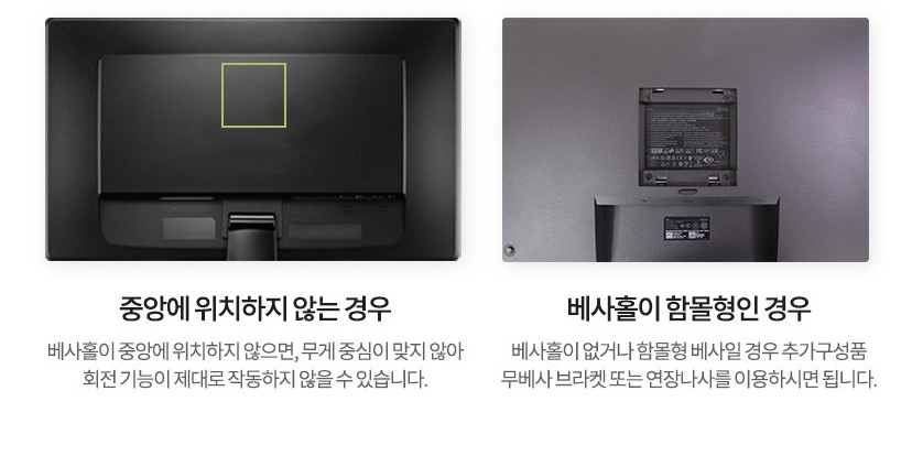 베사 마운트 홀 규격을 준수하기 때문에 대부분의 모니터를 체결할 수 있습니다. VESA란 Vedeo Electrons Standards Association의 약자로 미국 비디오 전공학 협회에서 모니터 및 TV 뒷면에 브래킷 체결 홀을 지칭하는 국제 표준규격입니다.