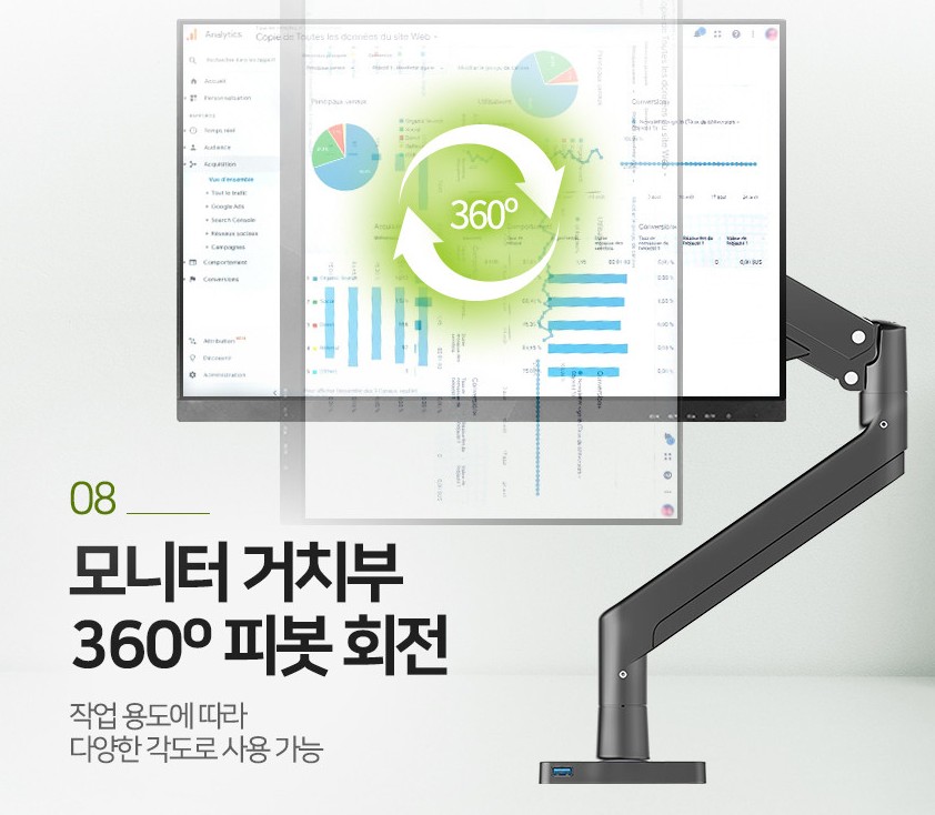 모니터 암 사용으로 좁은 공간을 더 넓게 활용이 가능합니다. 가스 실린더 방식으로 고중량 하중에도 자유자재로 조절이 가능하며 최대 630mm까지 모니터 거리 조절을 할 수 있으며, 높이는 520mm까지 조절하며, 상하 각도 조절 또한 -30도부터 +85도까지, 3축 회전 시스템, 360도 피봇 회전 등이 가능합니다.