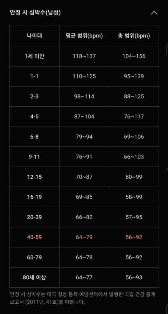 휴식 중일 때의 분당 연령별 심박수는 아래와 같습니다.